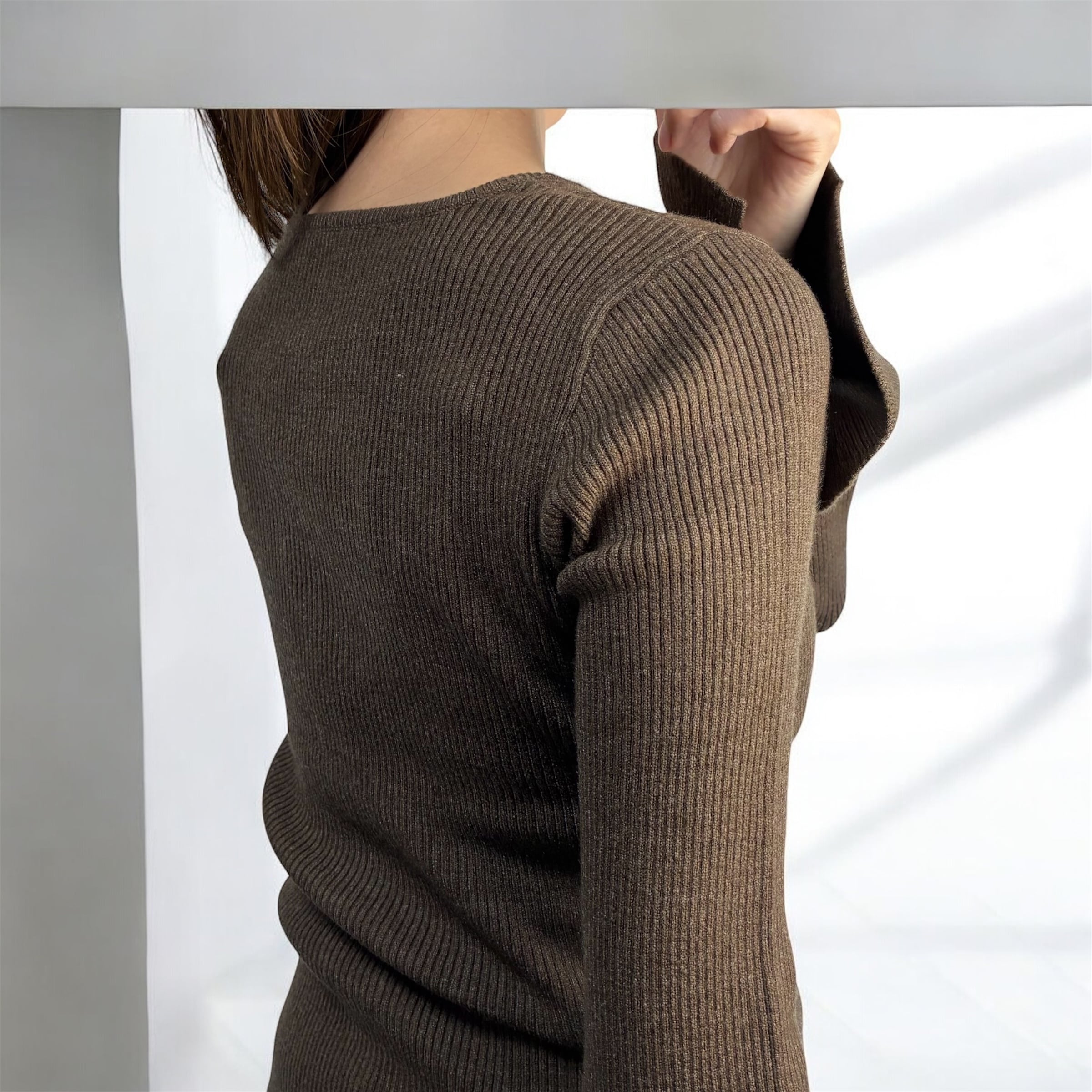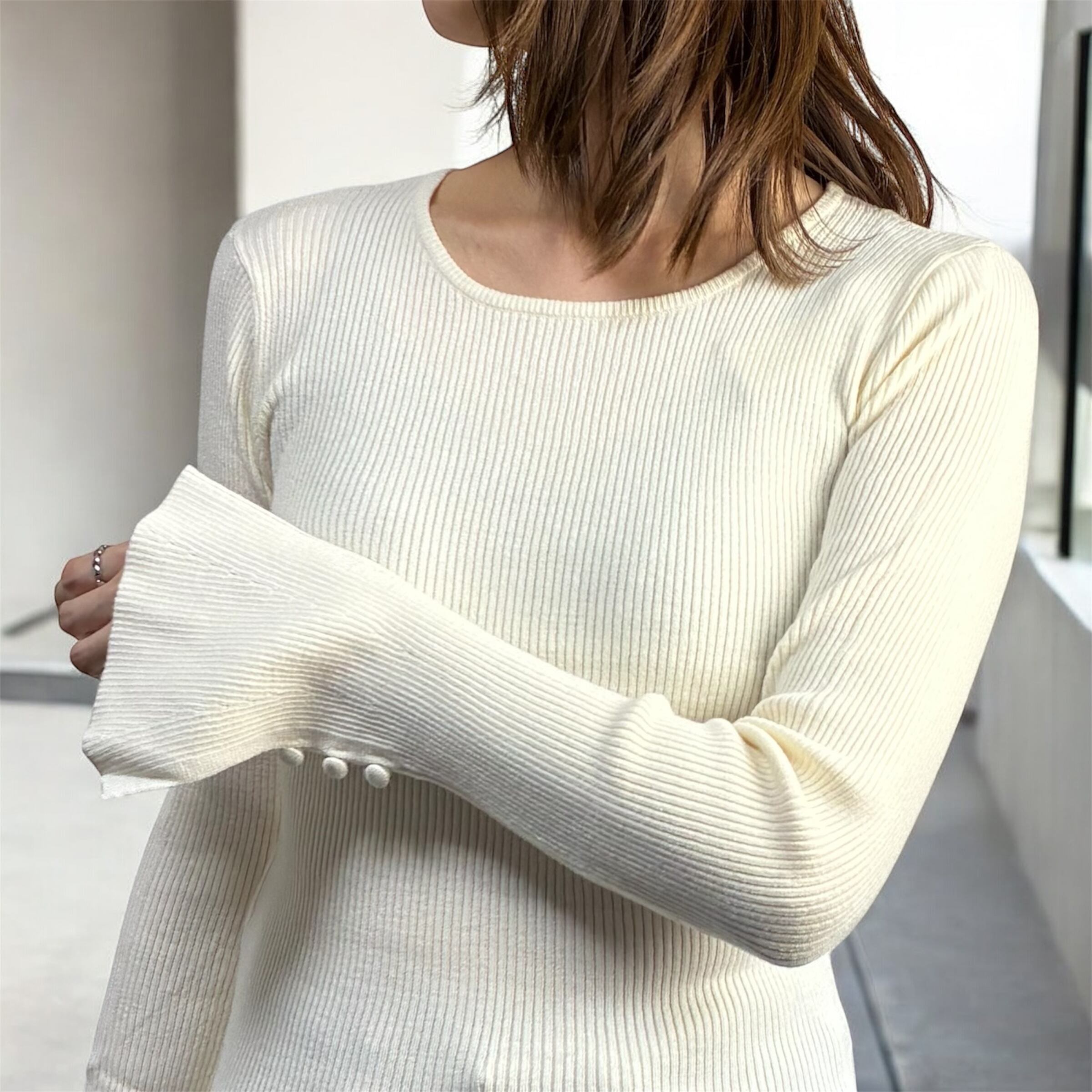 伸縮性抜群で柔らかい肌触りが魅力のクールクール素材を使用。袖がフレアになっているので、1枚ではもちろんレイヤードにもお楽しみいただけるアイテムです。