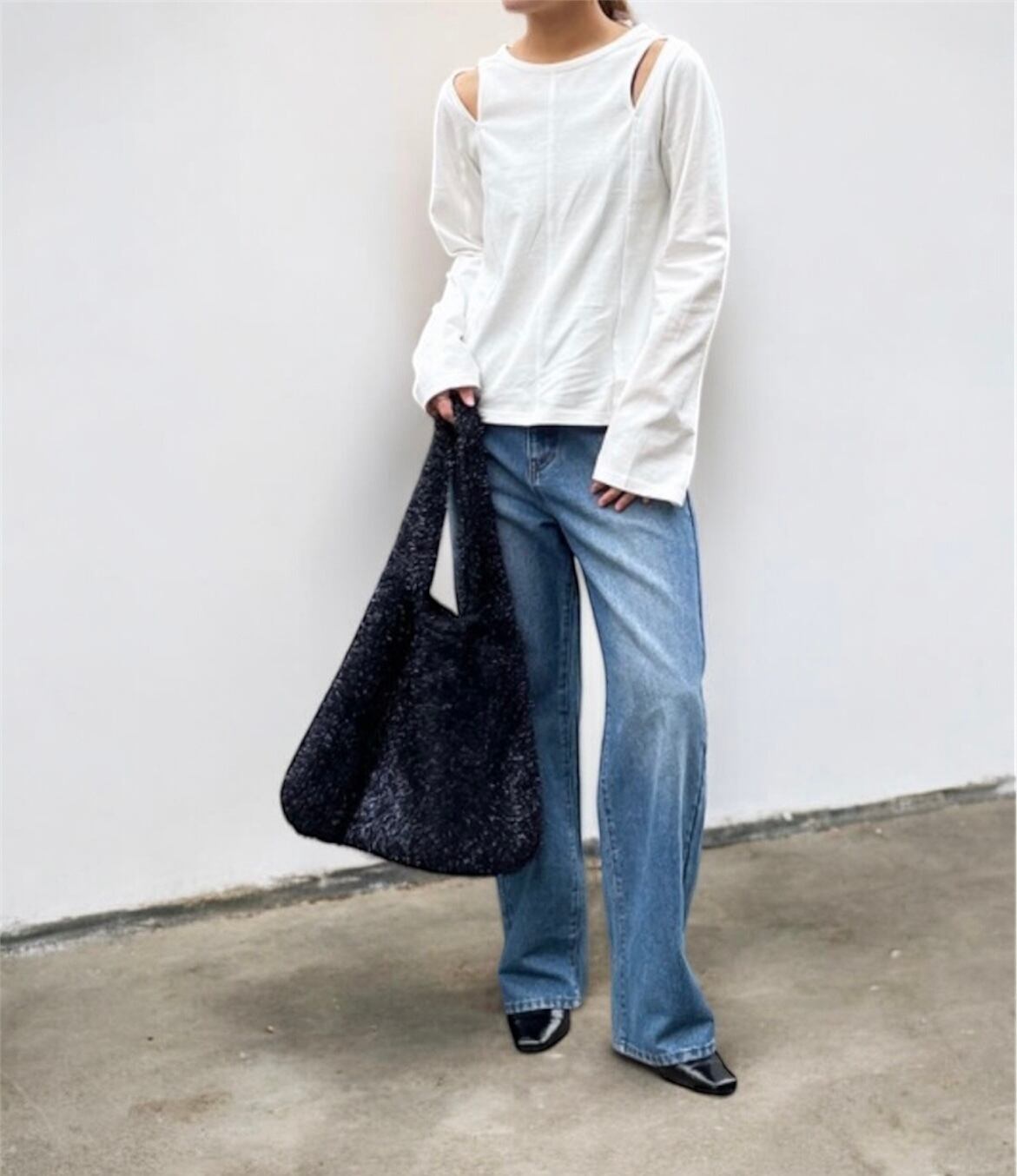光沢感が今年らしいラメフェザーニット素材。持つだけでいつものコーデが華やかな印象に◎