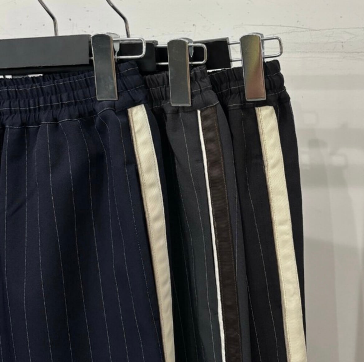 ベースに細かなピンストライプを施した生地を使用し、サイドに配色ラインを効かせたストレートパンツ。