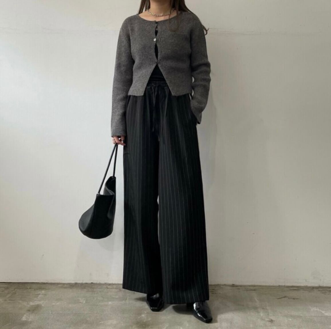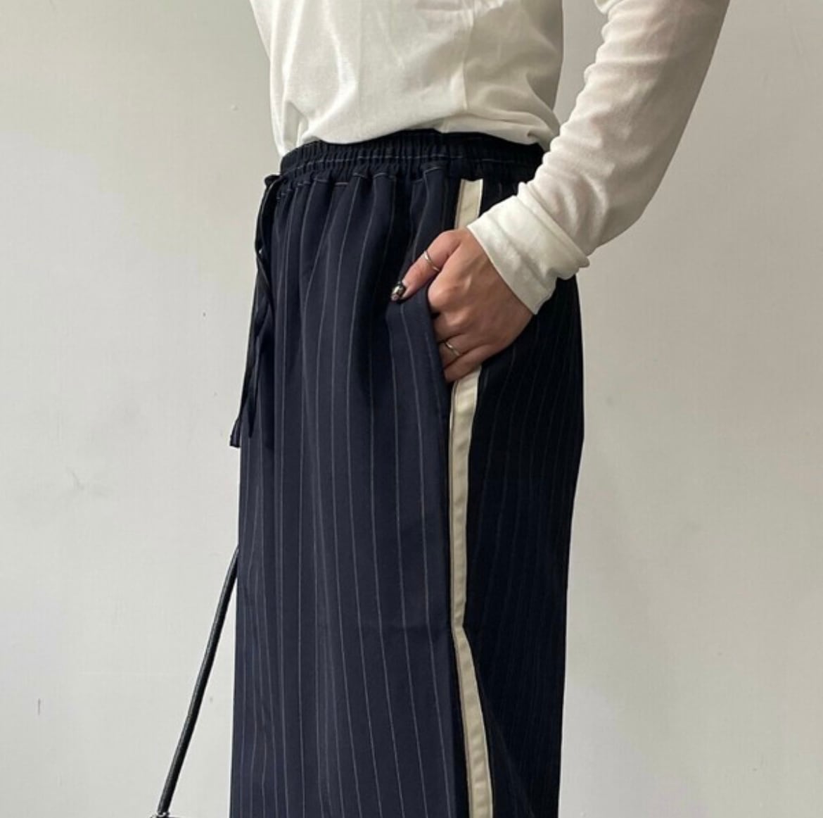 ピンストライプ柄が縦のラインを強調し、脚をすっきり見せてくれます◎
