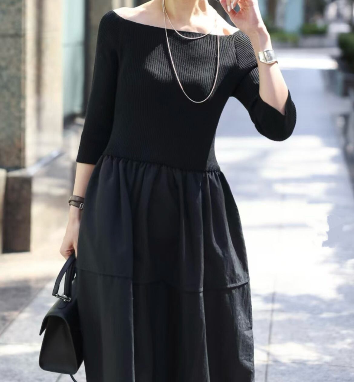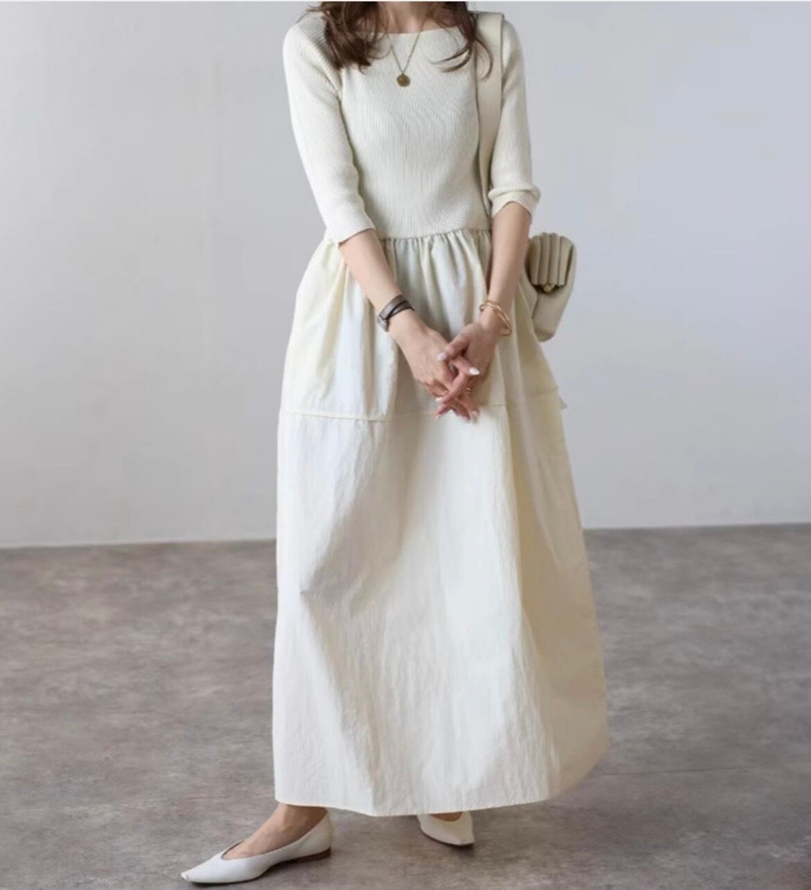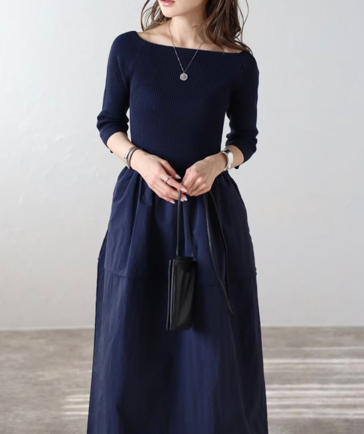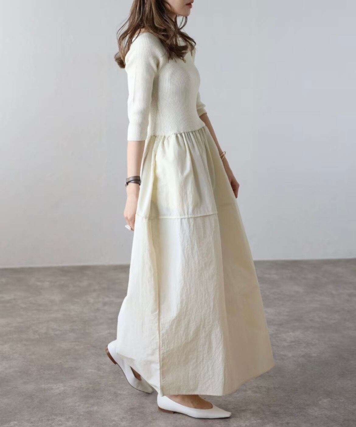 デザイン性と快適さが魅力のスクエアネックニットコンビコクーンワンピースが登場‼︎